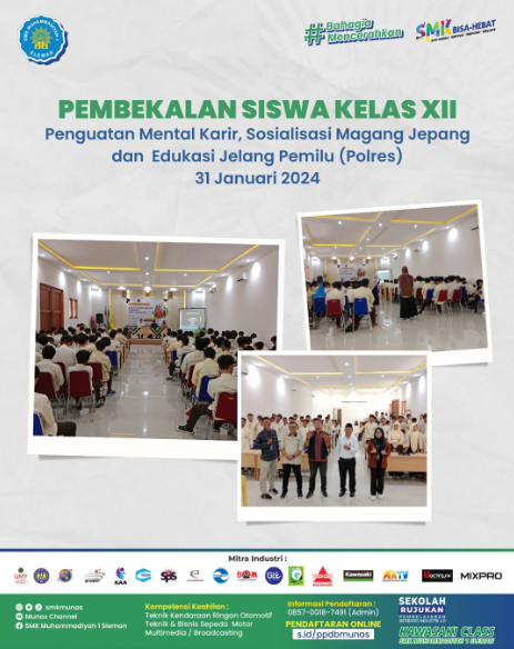 Pembekalan Siswa-Siswi Kelas XII Jurusan TKRO, TBSM, dan Multimedia SMK Muhammadiyah 1 Sleman dengan materi Penguatan Mental Karir Siswa dari UAD, Sosialisasi Magang Jepang dari LPK GLE Yogyakarta, dan Edukasi Jelang Pemilu oleh Polres Seleman. Rabu, 31 Januari 2024 di Aula SMK Muhammadiyah 1 Sleman